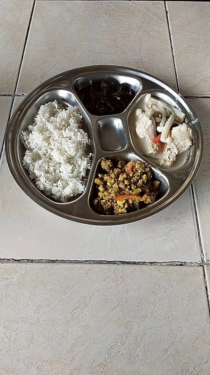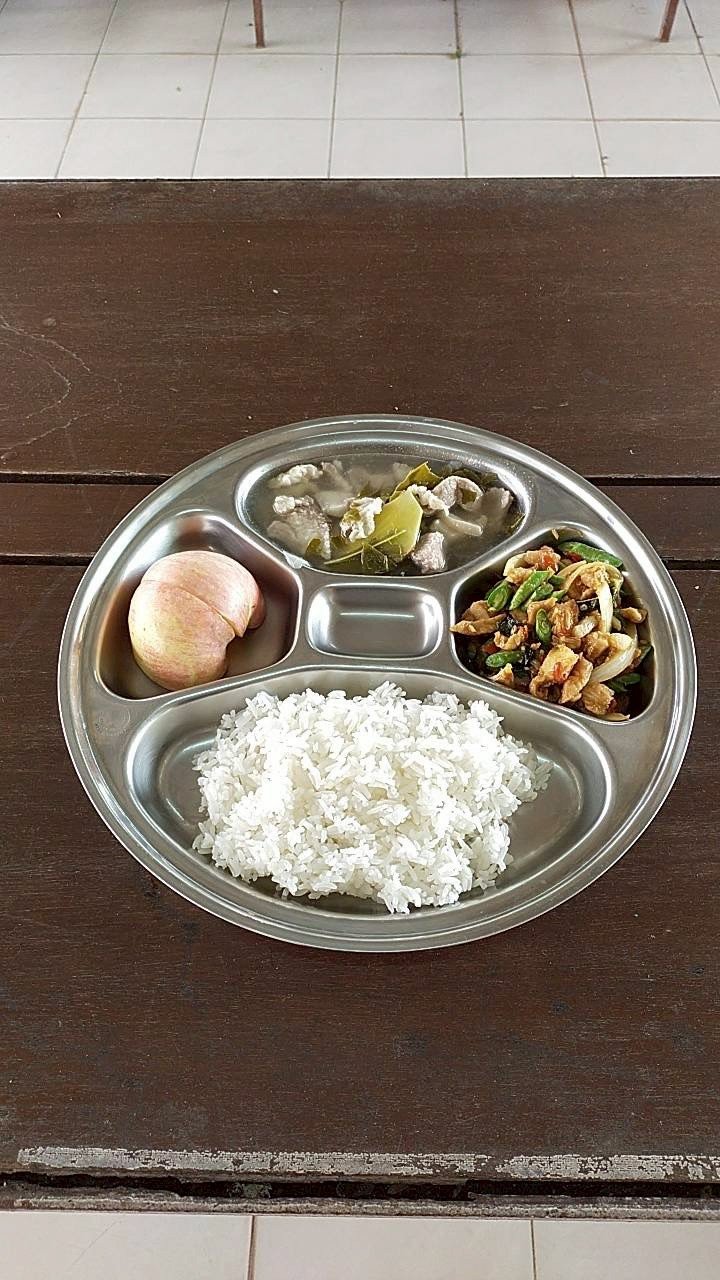 ผัดกระเพราไก่+ ต้มจืดหมูใบชะมวง+ผลไม้ตามฤดูกาล (แอปเปิ้ล)
