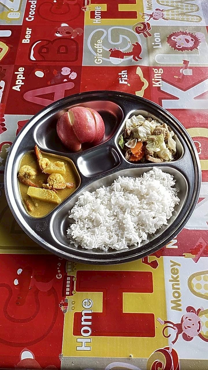 แกงกะทิกุ้งสับปะรด+ผัดไก่กะหล่ำปลี+ผลไม้ตามฤดูกาล (แอปเปิ้ล)