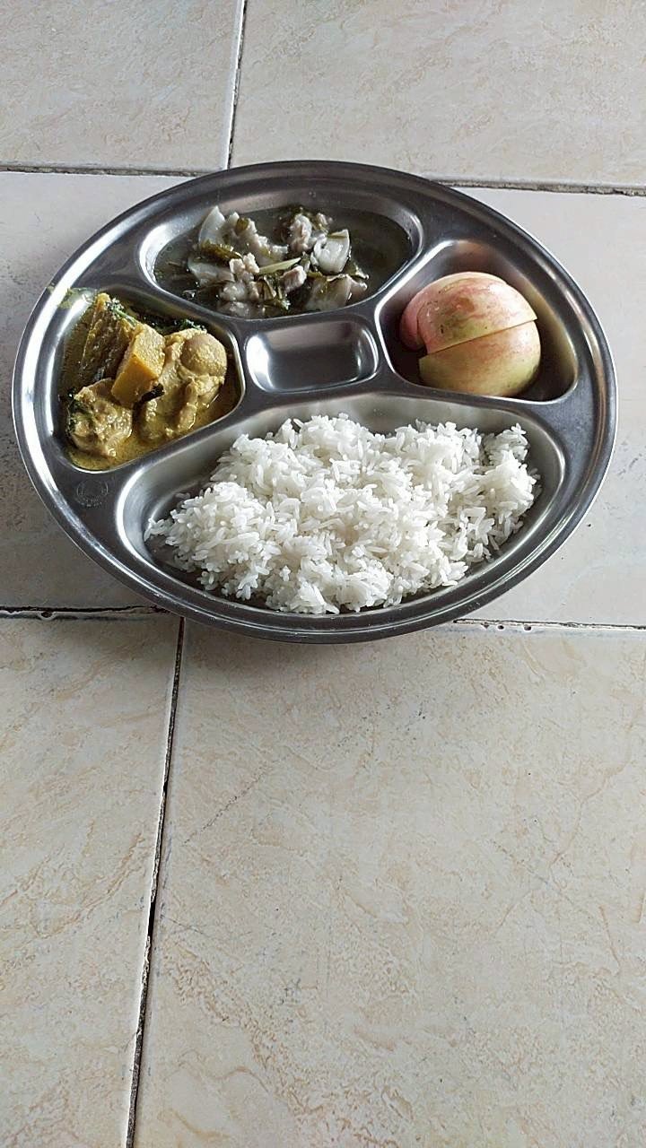 แกงส้มหมูผักรวม+ไก่ผัดพริกไทยดำ+ผลไม้ตามฤดูกาล (แอปเปิ้ล)
