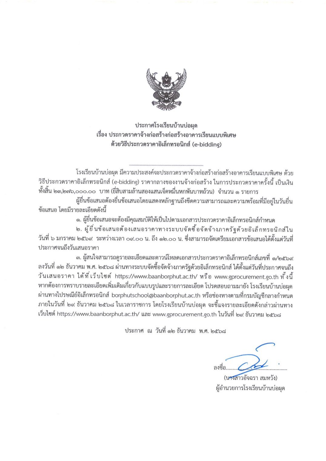 เรื่อง ประกวดราคาจ้างก่อสร้างอาคารเรียนแบบพิเศษ ด้วยวิธีประกวดราคาอิเล็กทรอนิกส์ (e-bidding)