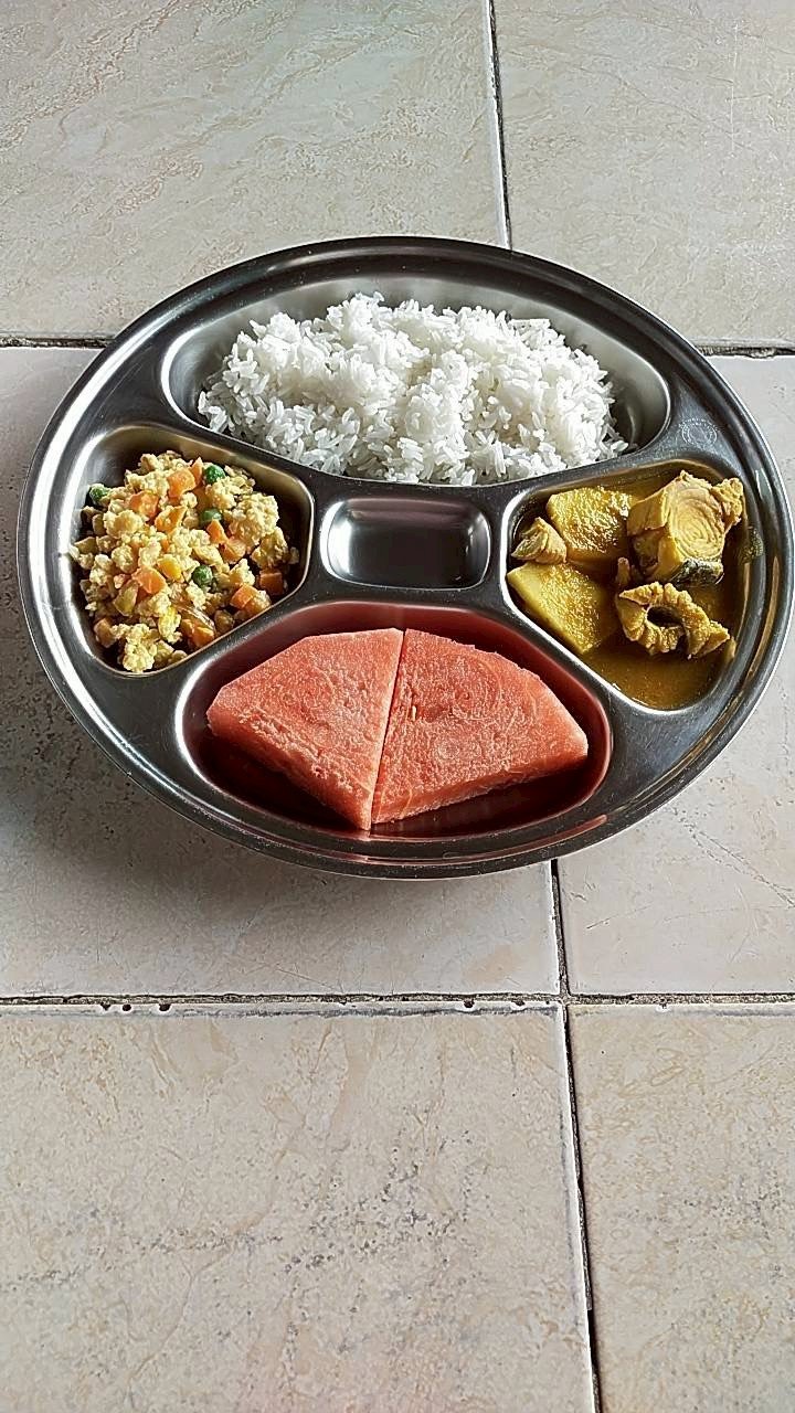 แกงส้มปลายอดมะพร้าว+ไข่ทรงเครื่อง+ผลไม้ตามฤดูกาล (แตงโม)