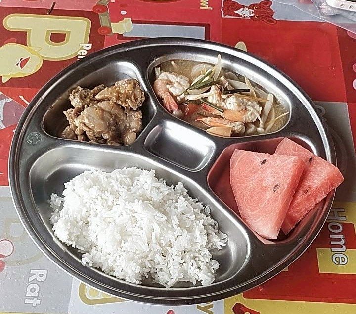 ต้มยำทะเล กุ้ง + ไก่ผัดกระเทียม + ผลไม้ตามฤดูกาล (แตงโม)